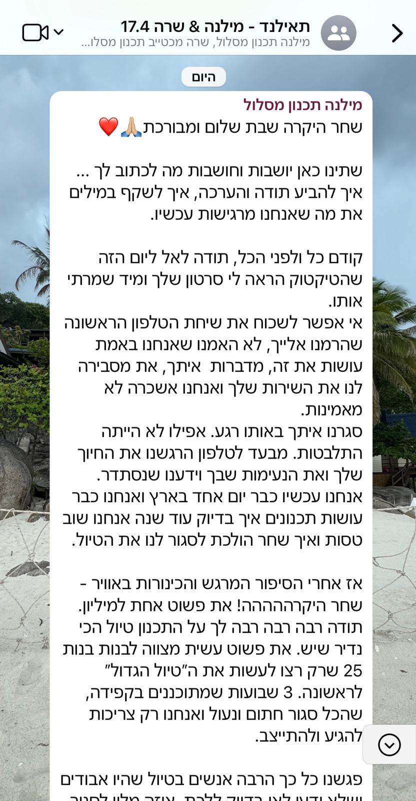 אני מציעה ליווי ותמיכה מרחוק, כך שבמקרה של שינוי, ביטול או בעיה בלתי צפויה – יש לכם כתובת לפנות אליה, עם פתרונות מהירים ומדויקים כדי להמשיך את הטיול בצורה חלקה.